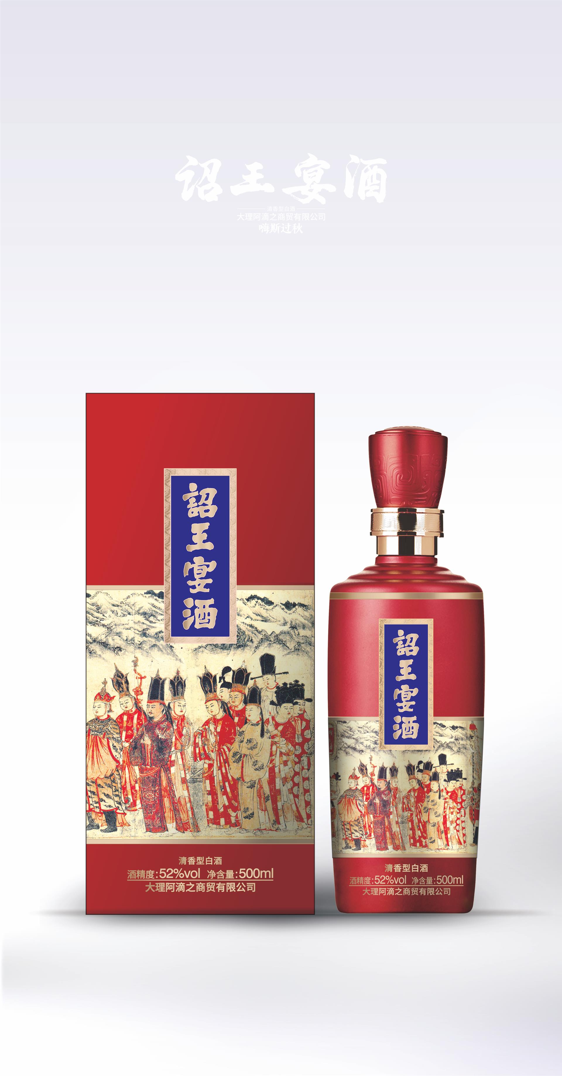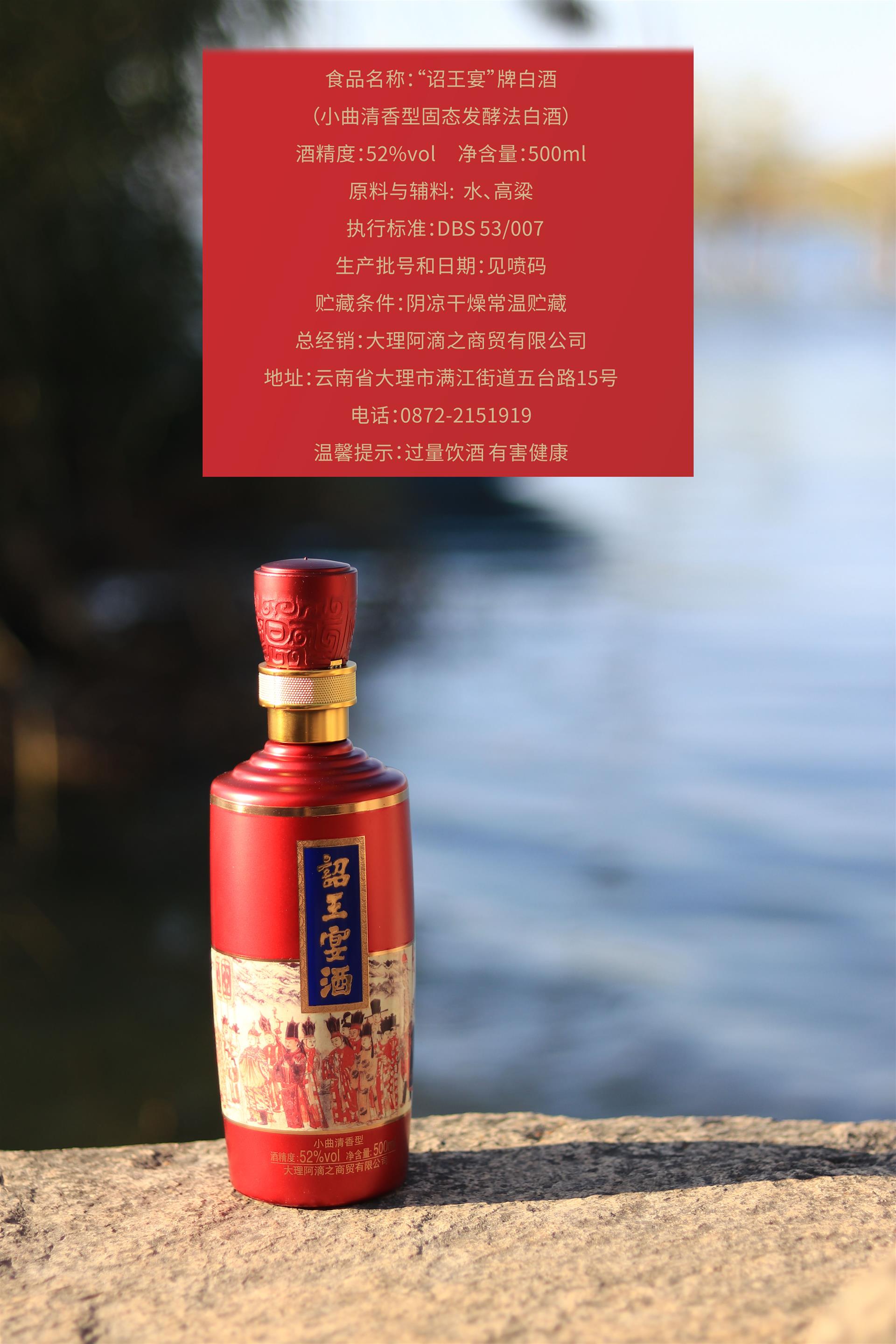 食品名称:“诏王宴”牌白酒(小曲清香型固态发酵法白酒)酒精度:52%vol 净含量:500ml原料与辅料: 水、高粱执行标准:DBS 53/007生产批号和日期:见喷码贮藏条件:阴凉干燥常温贮藏总经销:大理阿滴之商贸有限公司地址:云南省大理市满江街道五台路15号电话:0872-2151919温馨提示:过量饮酒 有害健康